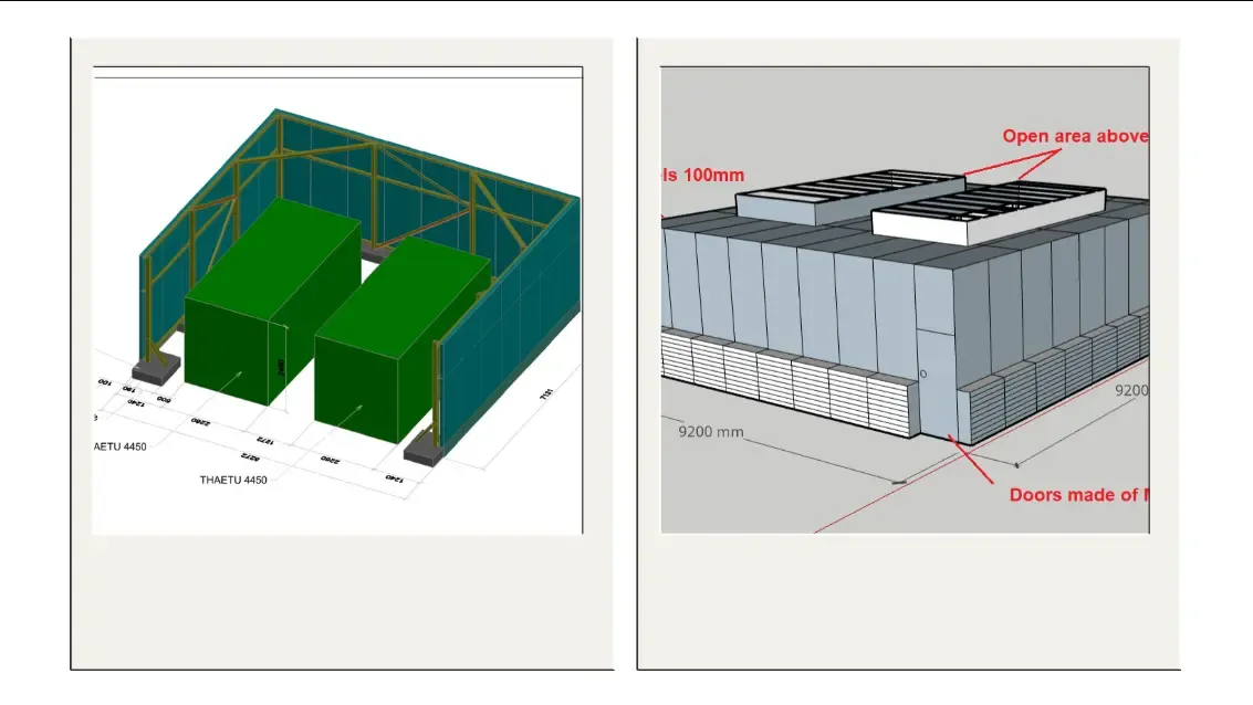 Проектът започна с ясно задание: клиентът първоначално поиска акустично заграждение от три стени и без покрив, с цел намаляване на шума, като същевременно се запази отворена вентилация над чилърите. Нашите инженери създадоха подробен модел на тази конфигурация и проведоха предварителни акустични симулации .