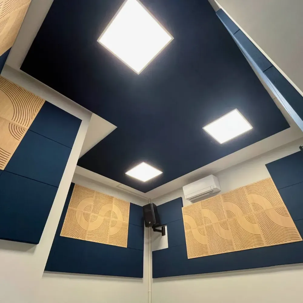 - Интегриране на осветлението: Внимателно проектирахме и осветлението, за да се слее с акустичните панели, осигурявайки функционалност без компромис с естетическото или акустичното представяне.