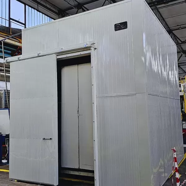 Разработихме звукоизолиращи кабини, съобразени със специфичните изисквания на Mann & Hummel. Тези кабини разполагаха с две плъзгащи се врати, като едната служеше като основна точка за достъп, оборудвана с прозорци за видимост, а другата - за задачи по поддръжката.